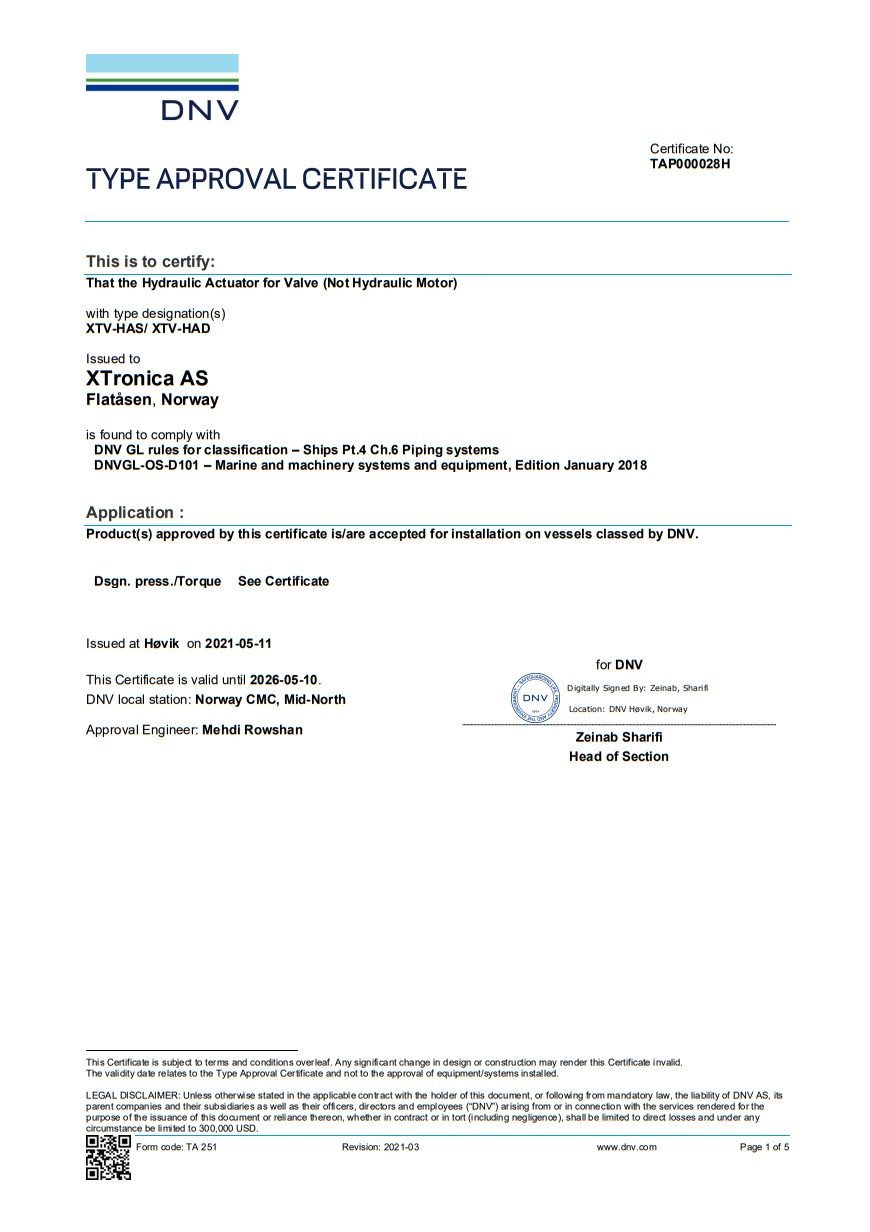 Hydraulisk aktuator for ventil DNV typegodkjenningssertifikat