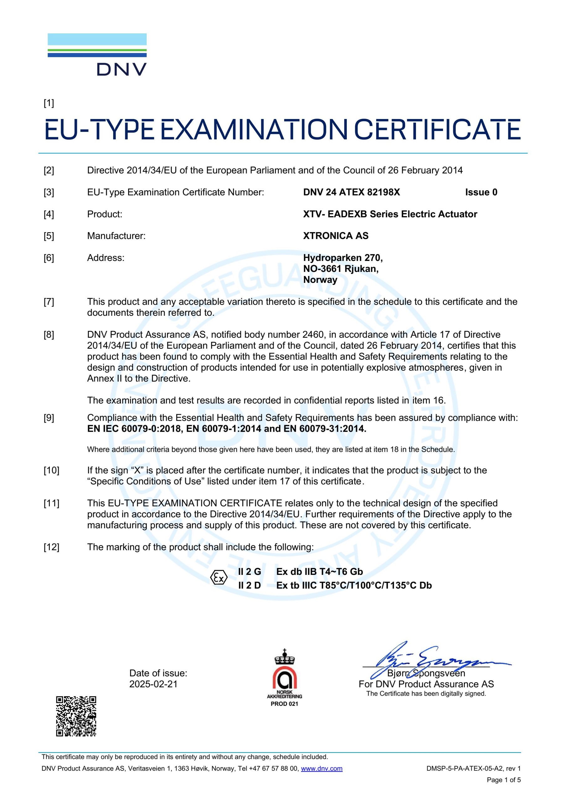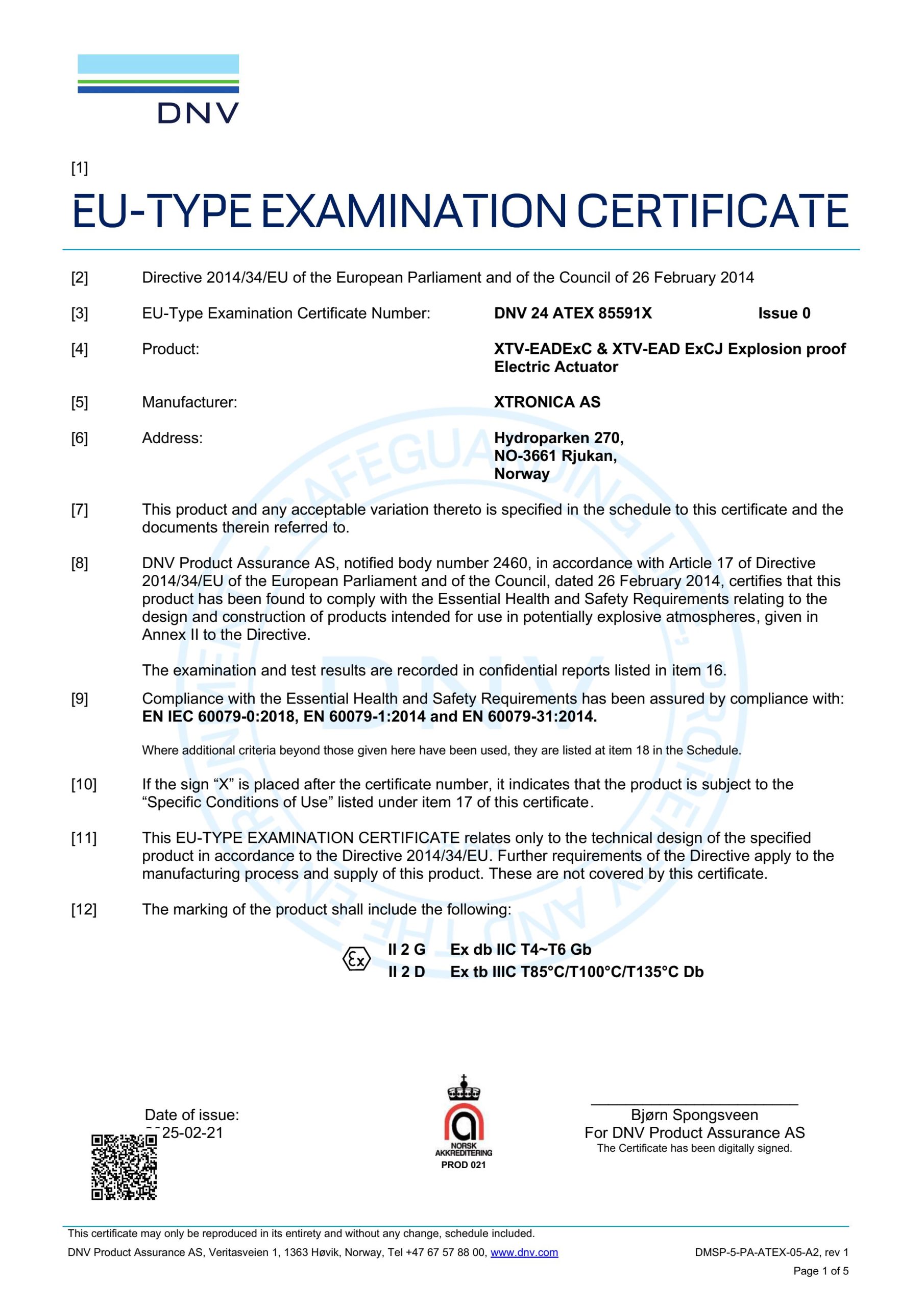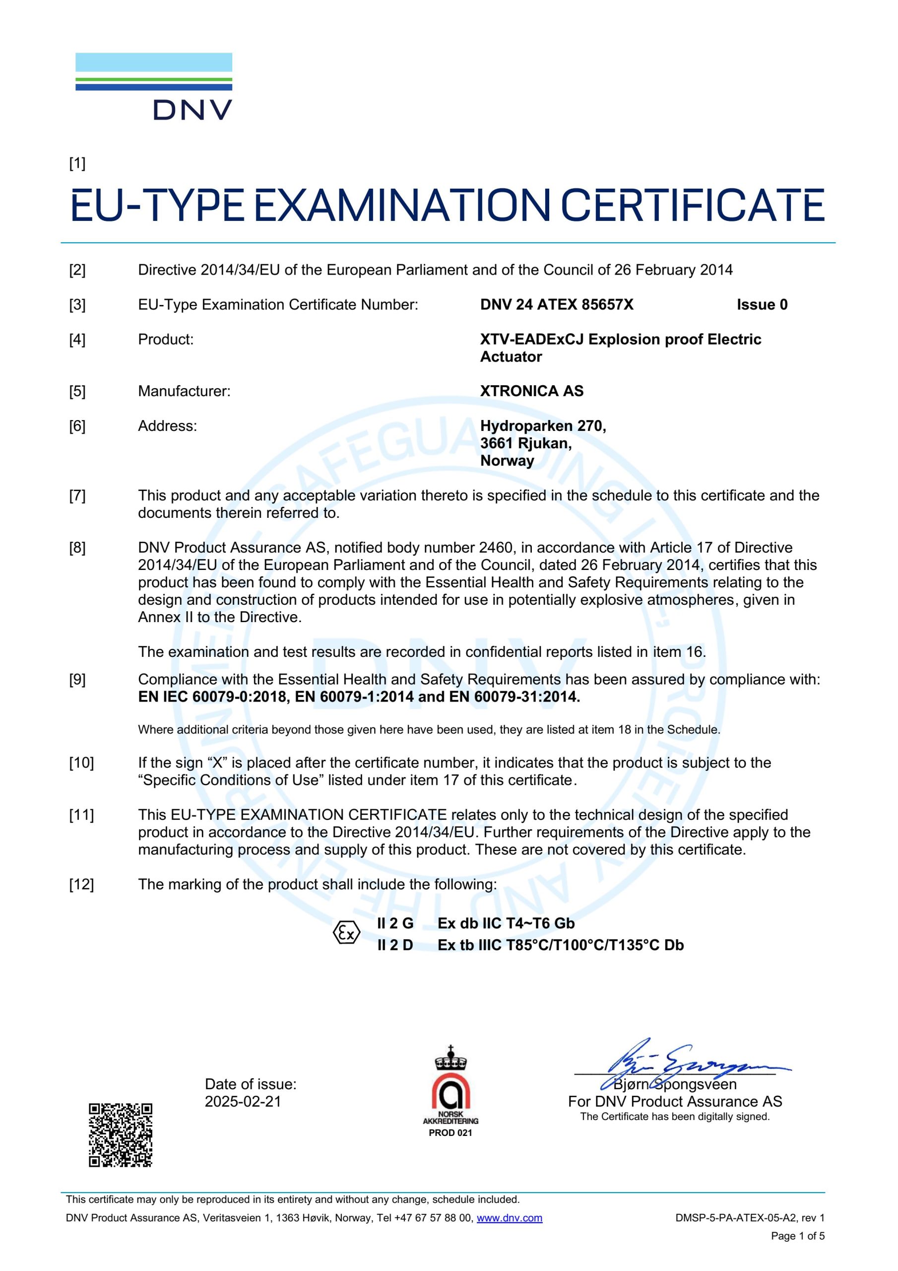 DNV ATEx-sertifikat for XTV-EADExCJ eksplosjonssikker elektrisk aktuator